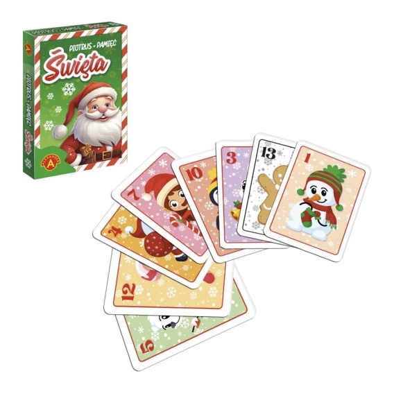 Zestaw 25 kart z grafikami w Świątecznym klimacie, dzięki którym można zagrać z dziećmi w dwie podstawowe gry karciane – „Piotruś” i „Pamięć”. Obie gry wspaniale ćwiczą spostrzegawczość, rozwijają skojarzenia oraz uczą zachowań społecznych. To idealny wstęp dla najmłodszych do świata gier, a także przyjemne wprowadzenie w świąteczny klimat.