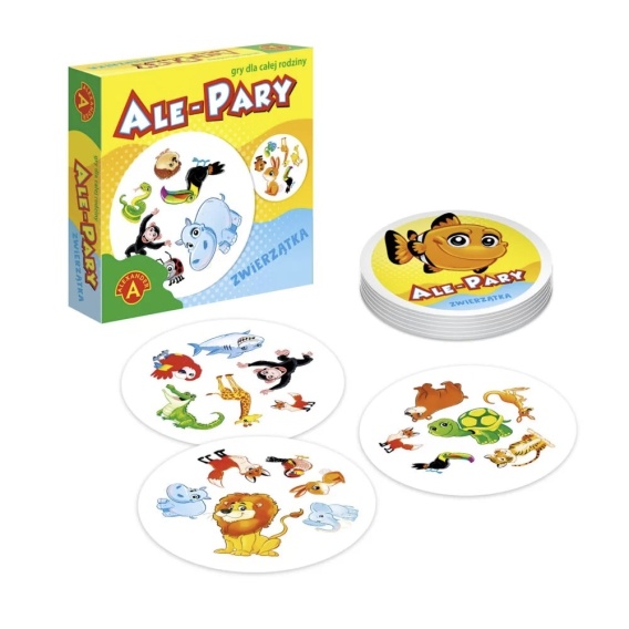 Ale Pary- Zwierzątka to szybka, prosta gra karciana, w której wygrywa ten kto wykaże się największą spostrzegawczością. W opakowaniu znajdziemy zestaw 31 kart z 6 obrazkami przedstawiającymi zwierzątka. Dwie dowolne karty zawsze mają po jednym wspólnym obrazku, ale żeby nie było zbyt łatwo, obrazki te często mają różną wielkość. Gra polega na jak najszybszym znalezieniu wspólnego obrazka. W zależności od wariantu wygrywa ten, kto zdobędzie najwięcej kart, bądź jak najszybciej pozbędzie się wszystkich.