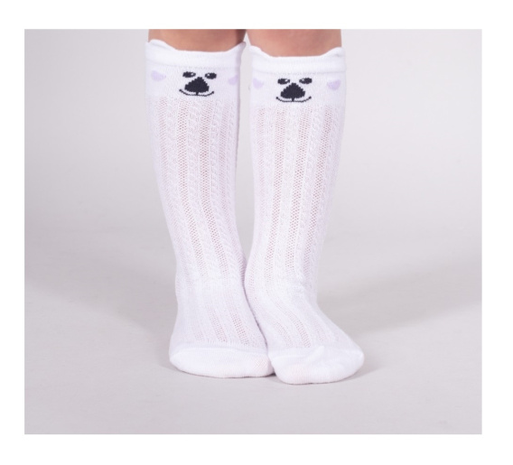 To model o długości przed kolano. Z uroczym misiem z przodu. Posiada ozdobne uszka przy ściągaczu, które wkomponowane są we wzór skarpety. Podkolanówki są miłe w dotyku, idealnie dopasowują się do stopy. Dzięki bawełnianej, ażurowej strukturze są niezwykle przewiewne i miłe w dotyku.