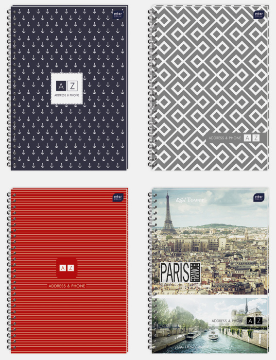 Format: A5. Oprawa twarda, pokryta błyszczącą folią, introligatorska. Kartki w linie z indeksem alfabetycznym.