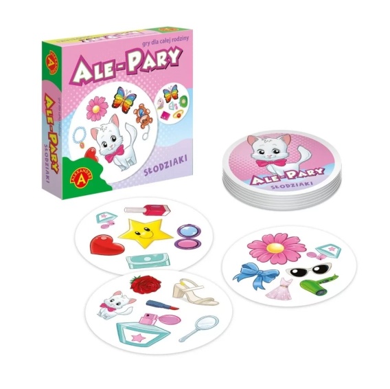 Ale Pary Słodziaki to szybka, prosta gra karciana w której wygrywa ten kto wykaże się największą spostrzegawczością. W opakowaniu znajdziemy zestaw 31 kart z 6 obrazkami na każdej z nich. Dwie dowolne karty zawsze mają po jednym wspólnym obrazku, ale żeby nie było zbyt łatwo, obrazki te często mają różną wielkość. Gra polega na jak najszybszym znalezieniu wspólnego obrazka. W zależności od wariantu wygrywa ten, kto zdobędzie najwięcej kart, bądź jak najszybciej pozbędzie się wszystkich.